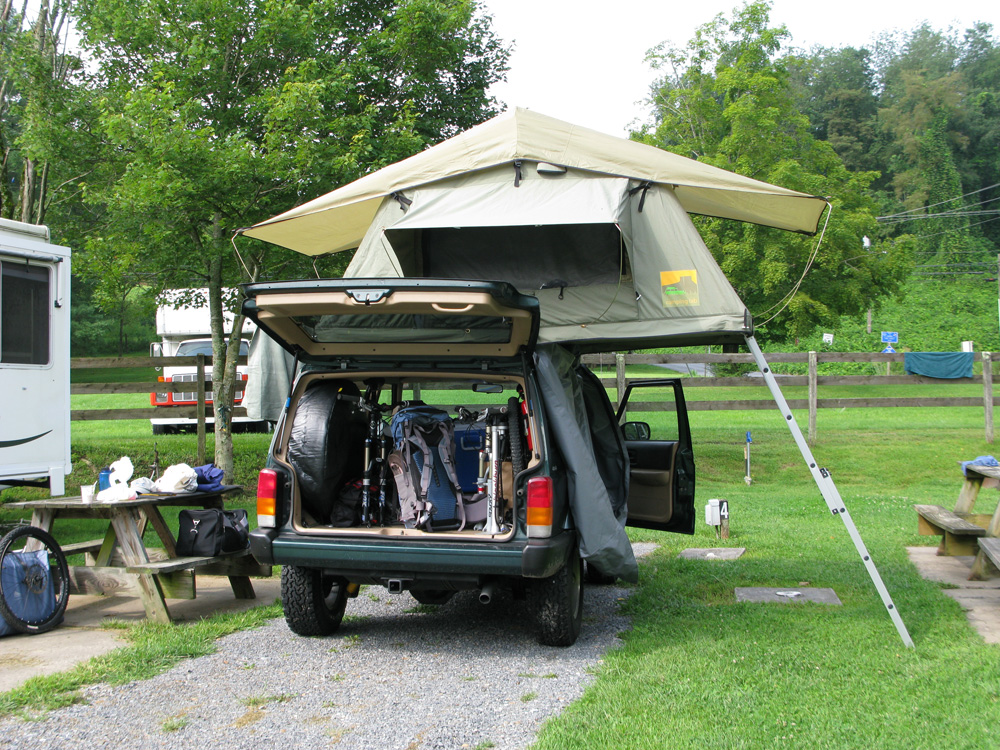 The campground we found seemed a little on the skeevy side at first, but it was full of nice folks who were very interested in our tent. Walking to the bathhouse a nice fellow said: “We’ve beeeen settin’ heerad-mirin’ yer tent.”  Then his buddy chimed in with: “It’s like a tree house on wheels!”  We agree, it’s like being a kid again up in a tree fort.