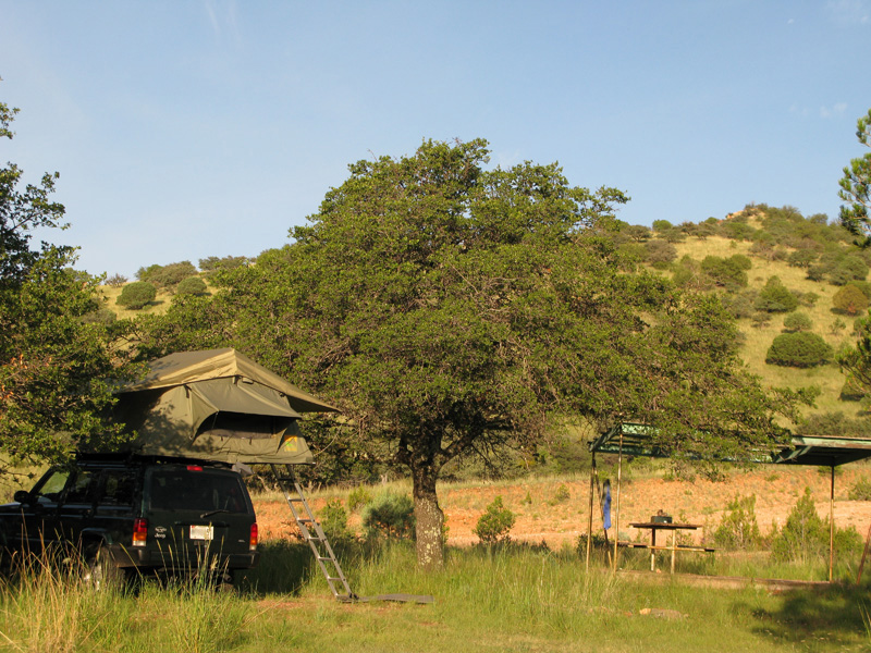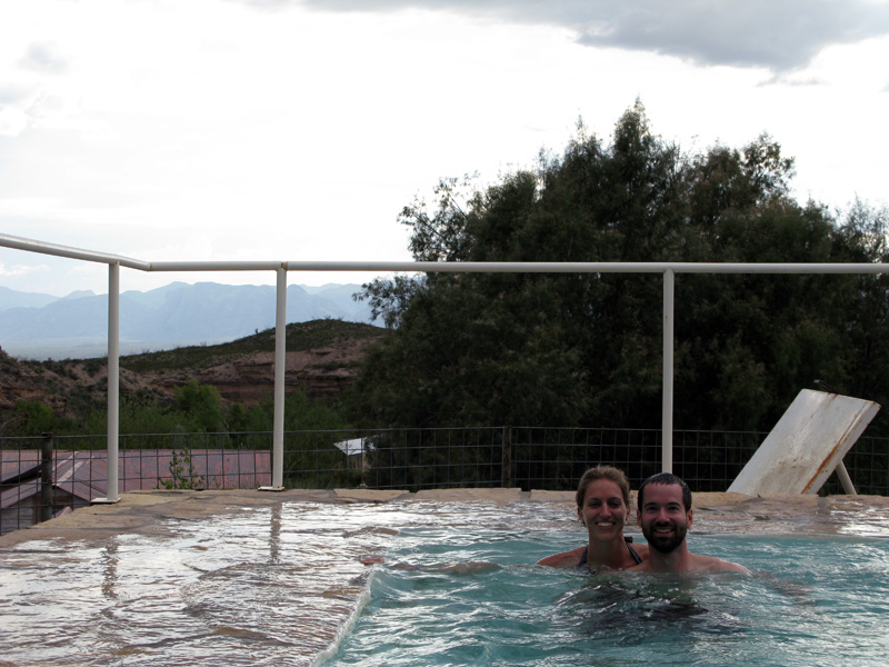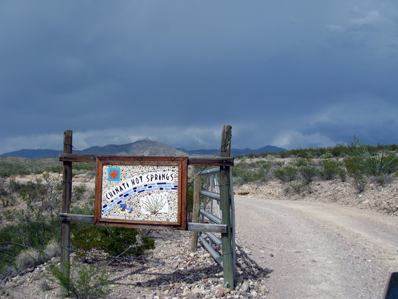 Indeed, Pinto Canyon Road turned into a gravel (and very rocky) road cutting through the Chinati mountains, though we safely made it to our destination 2 hours later.  Pat thoroughly enjoyed airing down the tires and switching into 4-low, after all the pavement we’ve been on.  After seeing first-hand how remote and magical this place was – we thought it best to stay 2 nights.  Chinati Hotsprings (owned by the CEO of Tyco) is situated about 10 miles from the Mexican border, so you can see the imposing Sierra Madre mountains in the distance.  As mentioned, the resort is equipped with a great communal kitchen, a natural hot tub, private hot bath rooms, a cold-water pool, an outdoor shower, and many cabins to choose from.  We opted for out roof-top bedroom.  It was a delightful and relaxing 2 days/nights – a little oasis in the middle of the desert.