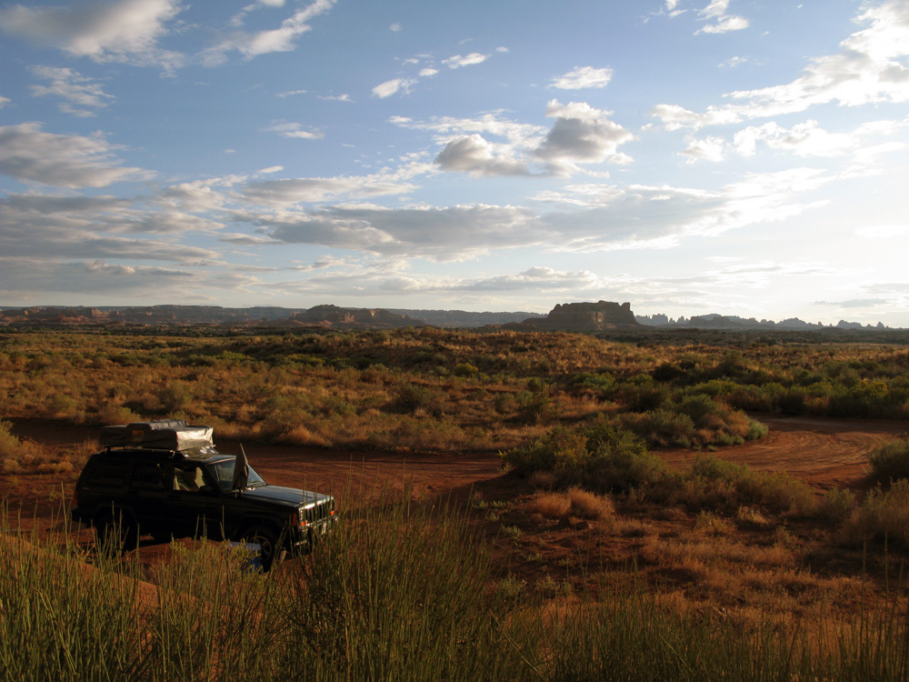 We needed to get to Moab, Utah by September 19th to meet up with our Green River canoe crew so we drove north to Canyonlands National Park – Needles district. We spent the night at the awesome Needles Outpost campground, which was on the park’s border and has showers! It had been a few days… The next day we went for a really long desert hike on the Chesler Park trail around Canyonlands. This 12 mile loop went past the awesome needle-like rock formations (thus the Needles district) and through narrow slot canyons. We were exhausted from the terrain and heat, but enjoyed the hike thoroughly. We had only a short drive to Moab that afternoon and gorged ourselves at the delicious Pasta Jays restaurant once we arrived, another fine recommendation from Todd and Ron whom we met in Telluride. We ate a ton and relaxed that evening at a campground in town that was super packed full of Jeepers and mountain bikers. Moab is our kind of town! It’s nestled in a valley surrounded by red rock and Arches National Park. It’s on the bank of the Colorado River, so there are lush cottonwood trees all around town giving it a nice green glow. A tourist town for sure, the main draws are mountain biking, river running and four wheel drive tours. There are some really good restaurants too.