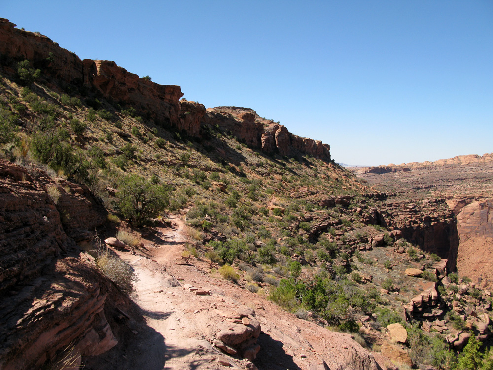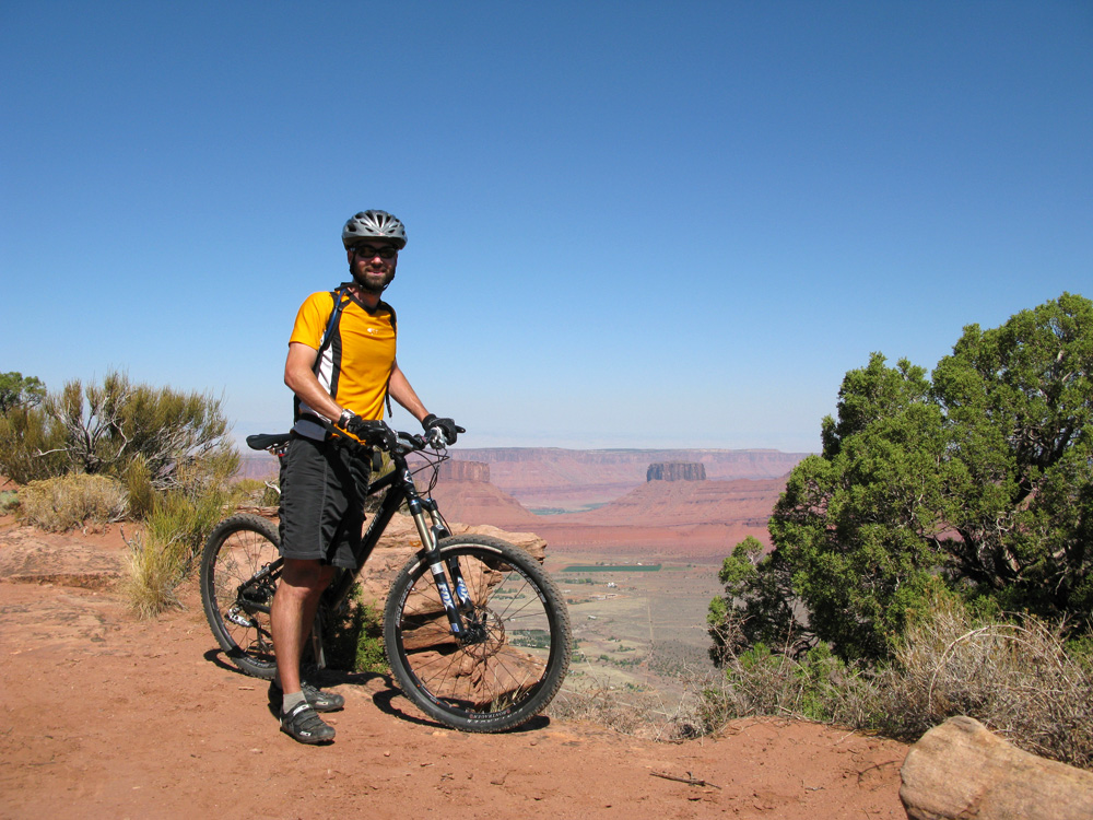 The next morning while Caro relaxed at a coffee shop and worked on the blog, I went for a ride on what could be the most famous mountain bike trail in the world, Slickrock. It was a hot one but the trail was excellent, probably the most traction I’ve ever had on a bike. I could literally stand up and lean over the bars on the steep climbs and not lose grip. Good thing because the trail seemed to be all steep climbs! As I crested the top of one of those climbs, a group on a Hummer tour saw me make it and let out a big cheer – it was great! Completely beat, I picked up Caro and drove down the main drag in Moab to meet up with the canoe crew: Brent, Mandy, Brad and Steve. We stayed that night at the Ramada Inn, our first night in a hotel since the trip began!