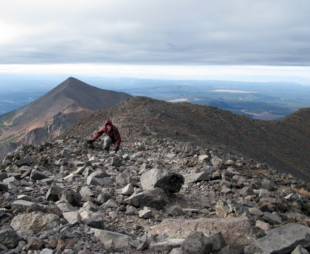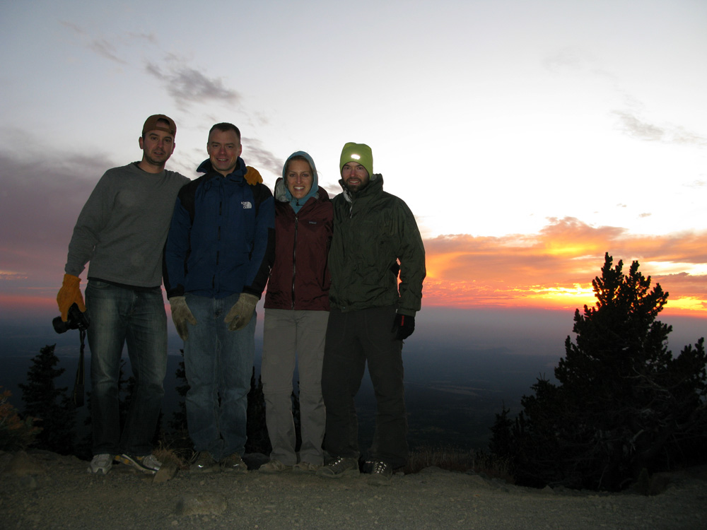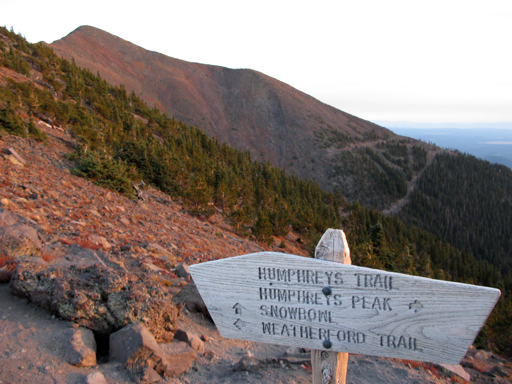 Our first stop being the Arizona Snowbowl in Flagstaff to climb the highest peak in Arizona, Mount Humphreys.  The extinct volcano is 12,637 feet and soars well above everything else in the state.  Our alpine start was actually late afternoon, since we intended to sleep on the mountain that night.  Steve assured us that this could be done, since there is a rock shelter up top that protects us from the elements.  So we started our trek around 4 PM. Needless to say we had most of the mountain to ourselves, except for a few hikers coming down. We climbed about 3,000 vertical feet and 3.5 miles up to the saddle, where we discovered a colorful sunset and strong winds.  A cold front had hit northern Arizona the day before, so we were expecting low 20s and perhaps high teens at night.  We still had another 1,000 feet of tundra to climb to the top, so we thought it best to stay where we were and set up camp for the night.  That was not hard to do.  We laid down our thermarests and sleeping bags, and put on every piece of clothing we brought.  For dinner, Jesse and Steve had bought some gourmet salami, cheese and crackers, and we passed around a bottle of port wine as a night cap. There was little else to do but crawl into our sleeping bags, hope for slumber, and wait for the sun to rise.
