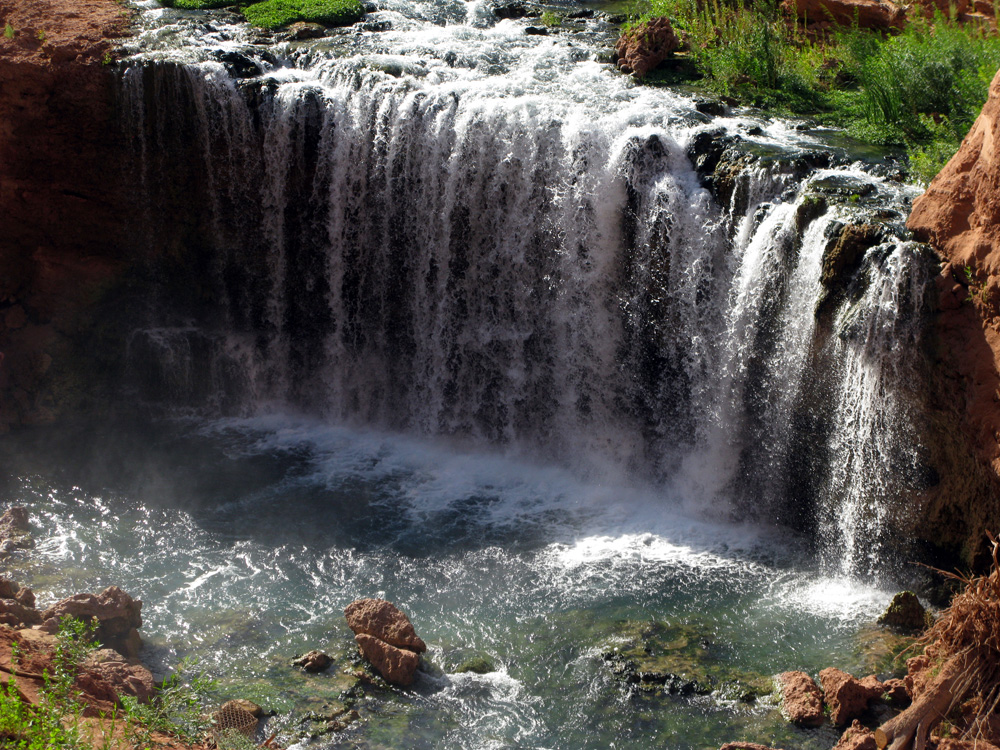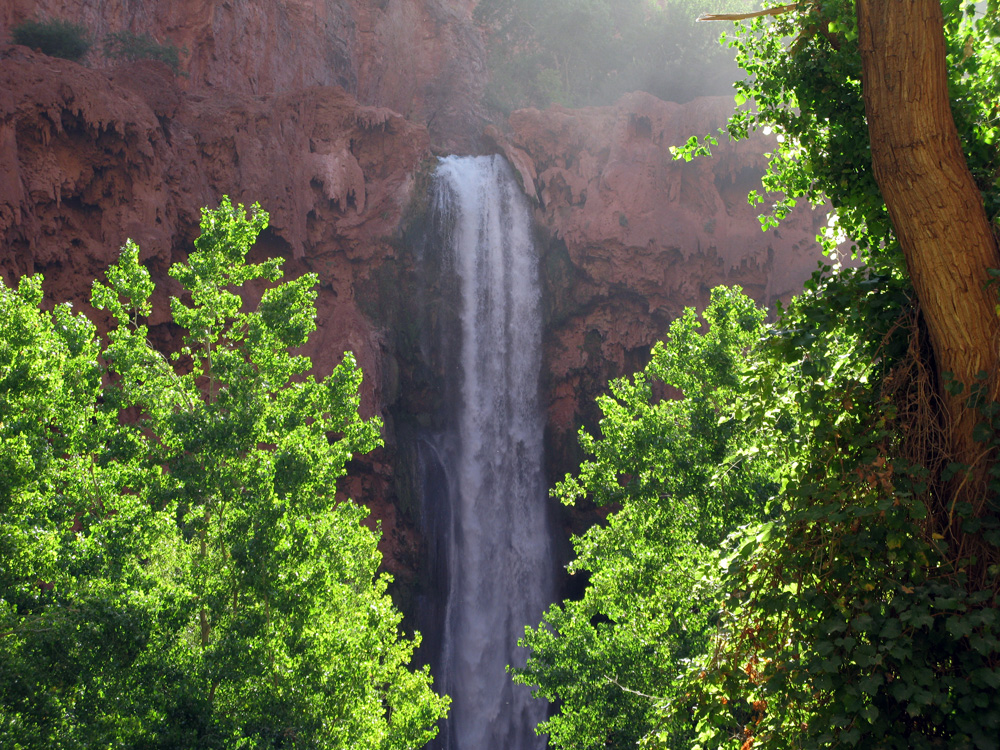 We headed back to Prescott that evening and made our way downtown to Whiskey row, where we celebrated our ascent with four Gentlemen Jacks on the rocks.  We ate a big dinner at a local brew pub to fuel the next day’s big feat: hiking down the Havasu Canyon.  After a 3-hour drive north towards the Grand Canyon, we entered the Supai Indian Reservation and drove all the way to the rim of the Havasu Canyon.  From there, we put on our packs and descended following the many switchbacks, passing hordes of hikers coming back up, and being passed by mules carrying supplies down. We continued 8 miles on rock and sand through red canyons, piercing green cottonwoods and past the poor Supai village until we reached the oasis: a series of waterfalls so grand and clear, Pat and I wondered why we had never heard of them before.  It was spectacular!  We couldn’t resist and went swimming right away at the base of the Havasu falls, although it was late afternoon and the sun wasn’t shinning on the falls anymore to warm our shivering bodies.  We got as close to the falls as we could bear, until the stinging water pounded us back.