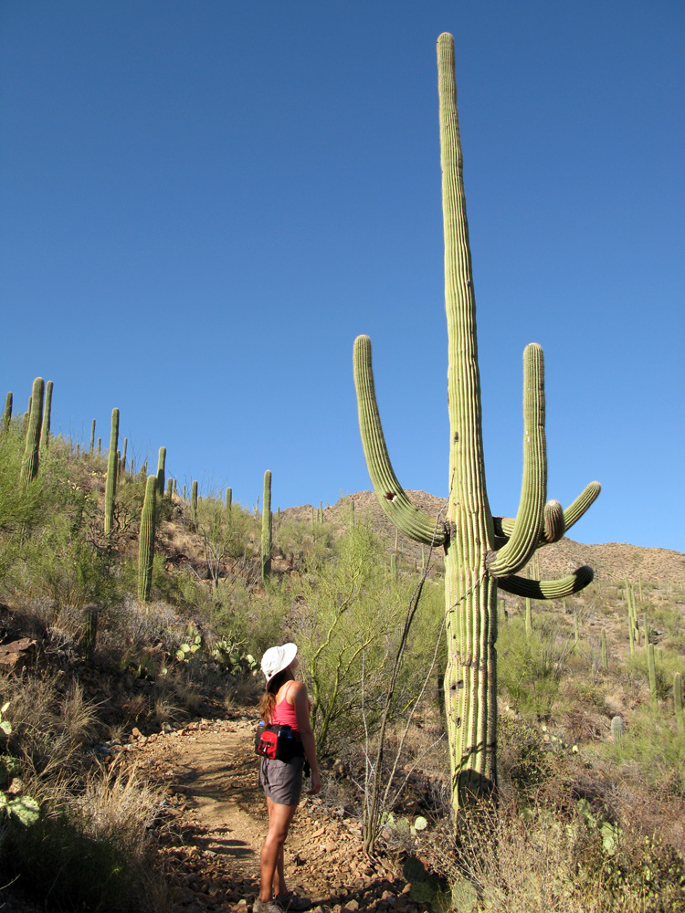 This being our last week in the US, we were committed to saving as much money as possible and taking full advantage of our camping gear.  So we went grocery shopping at Trader Joes and vowed not to eat out at all for the remainder of the trip and thus cook every meal on our two-burner stove (we almost made it – we bought lunch twice).  Similarly, we were pleased to take advantage of our National Park pass one last time (we’ve been to 16 total – thanks Jim and Kathy!) and visited the Saguaro (pronounced sa-WAH-ro) National Park on the west side of Tucson.  Picture the classic desert, multi-armed cactus – we were swimming in a forest of them!  We had fun attributing personalities to each and estimating their age (some live to be 200 years old).  We followed the Wasso Peak trail, which provided 360 views of Tucson and its suburbs against a setting sun.  We almost ran out of light coming down. That night we stayed at a nearby campground and cooked our second lamb steak dinner of the trip!