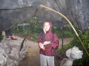 So we continue on the ring of fire, but first make a pit stop at Monteverde National Park to see another wonder of CR – the cloud forest, home to over 100 species of mammals and 400 species of birds. Because of its high altitude in the clouds, they say a light mist always falls on this wildlife refuge – to our misfortune, a great understatement. We were trapped in a terrible downpour for about 2 hours, which prevented any bird or animal sightings, or much visibility at the miradores (overlooks). We sought refuge in a makeshift shelter for about 45 minutes, but then realized it was a lost cause and braved the monsoon to finish our loop and exit the park.