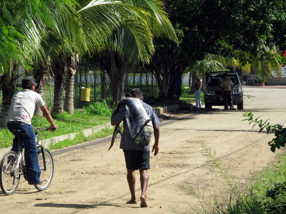 A local fisherman with a dorado over his shoulder at Playa El Coco.