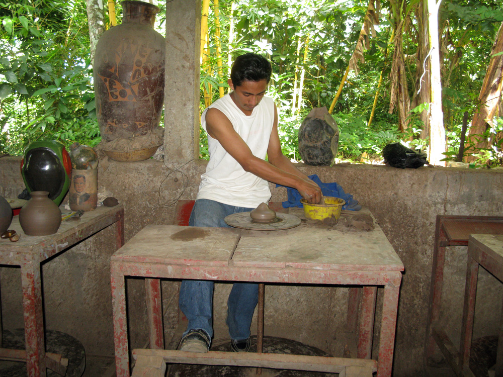 A local artist demonstrating ceramic work - spinning the wheel with his foot.